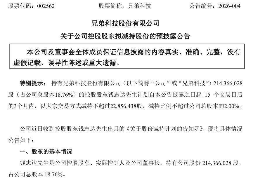 1月16日,兄弟科技(002562)发布公告,控股股东钱志达因自身资金需求,计划自公告披露之日起15个交易日后的3个月内,以大宗交易方式减持不超过2286万股,约占公司总股本的2%。